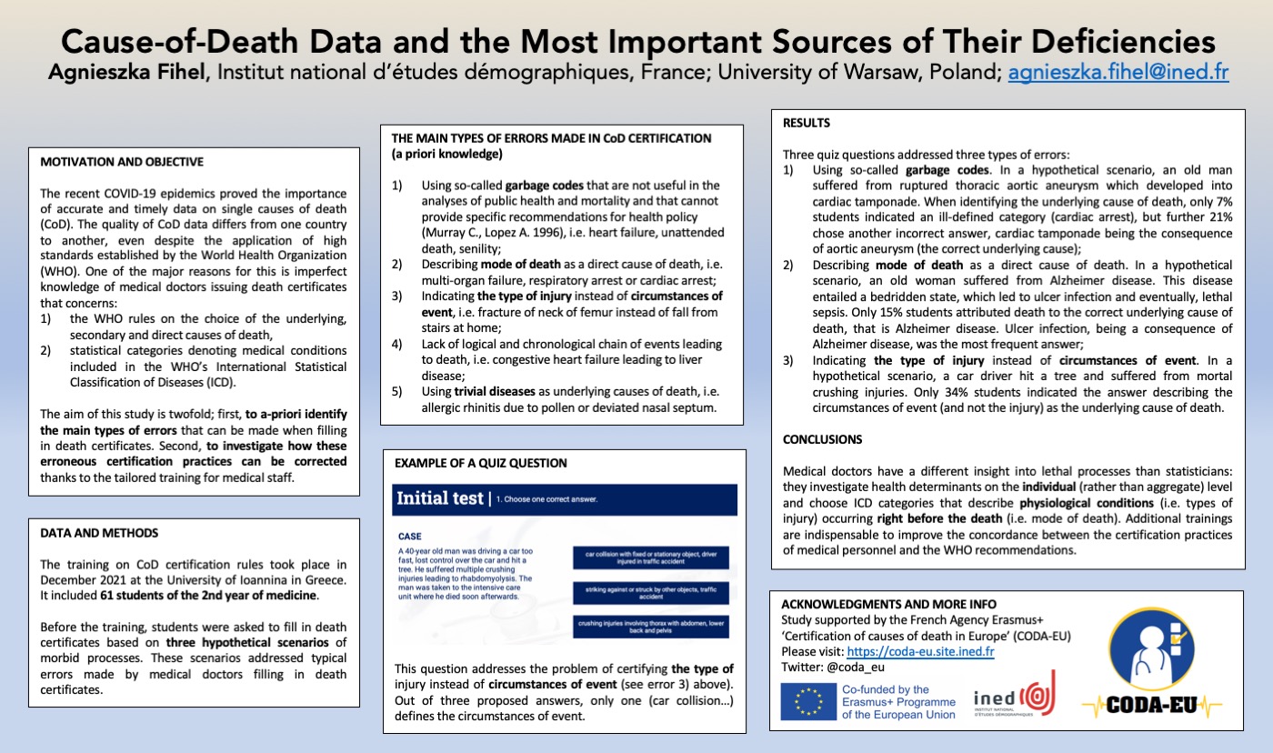 The European Population Conference (EPC) took place from June 29 to July 2, 2022 in Groningen, The Netherlands. A poster session was held virtually on June 30. Agnieszka Fihel presented her poster Cause-of-Death Data and The Most Important Sources of Their Deficiencies.